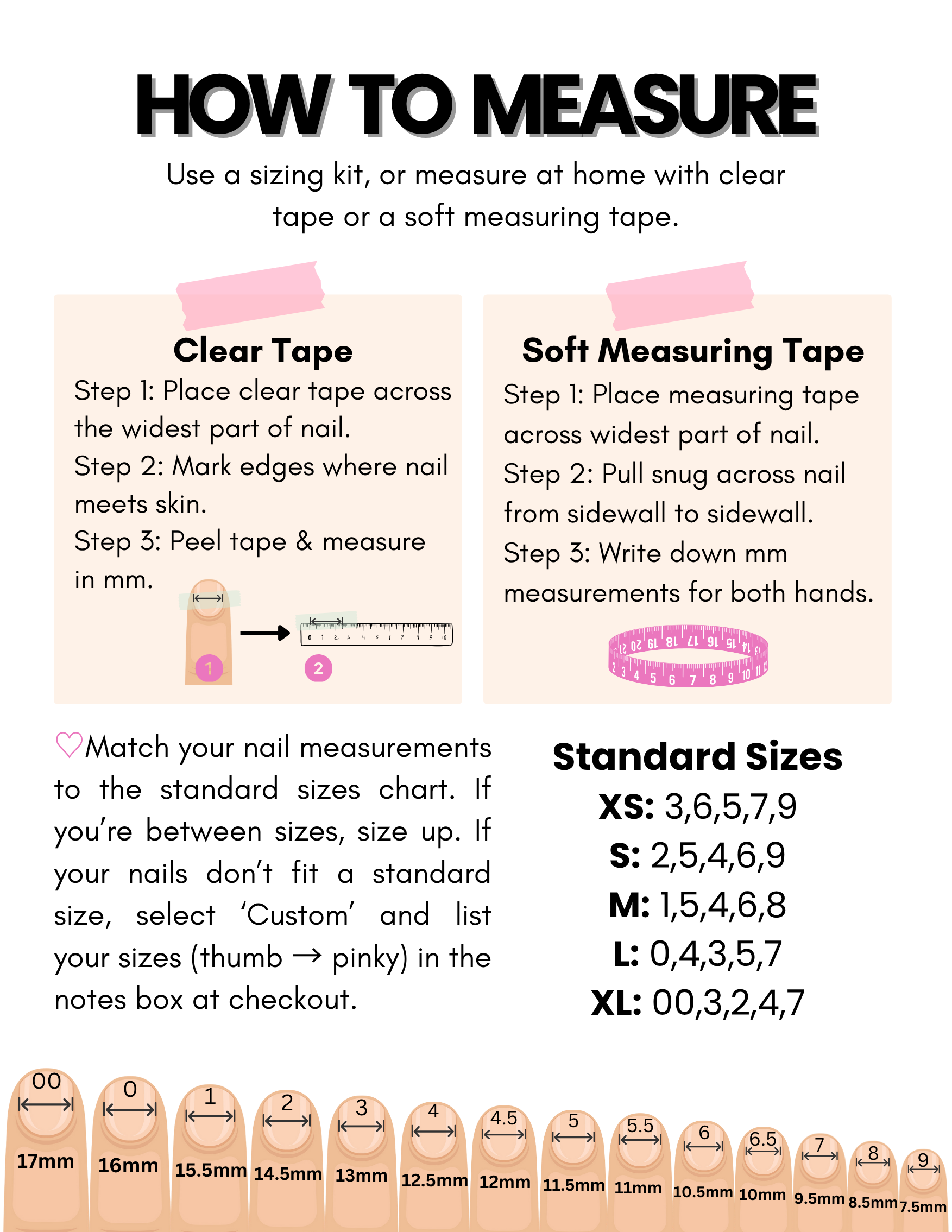 For custom sizing: Please select "Custom" and leave your individual nail sizes or measurements (either works for me) at checkout in the note box in the order of: Thumb, Index, Middle, Ring, Pinky. EX: 18 mm, 13 mm, 16 mm, 11 mm, 9 mm. OR 0, 3, 5, 5, 8.
